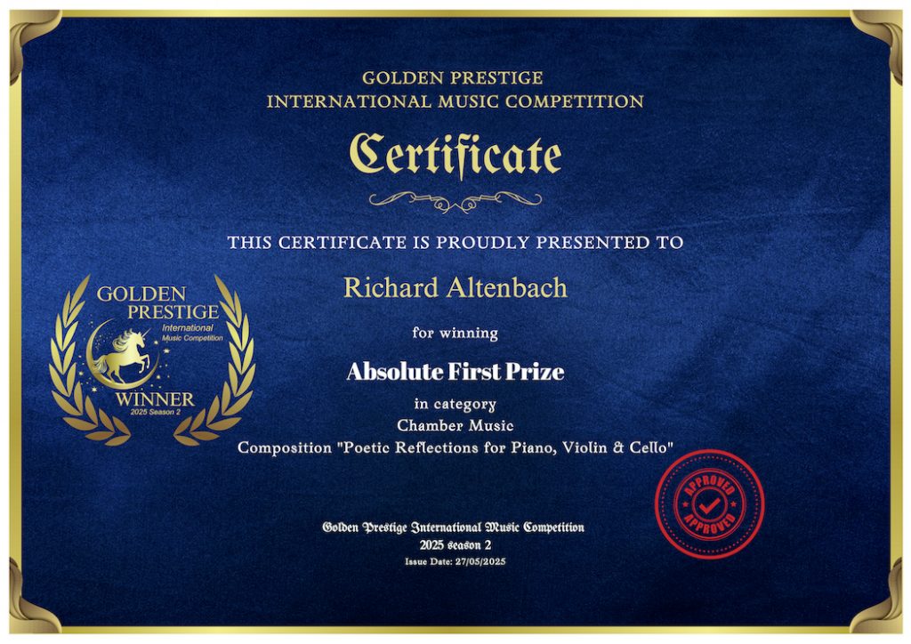 Richard’s performance of his Prize-Winning piece Poetic Reflections wins “Absolute First Prize” in the Chamber Music category in a 2025 international music competition.